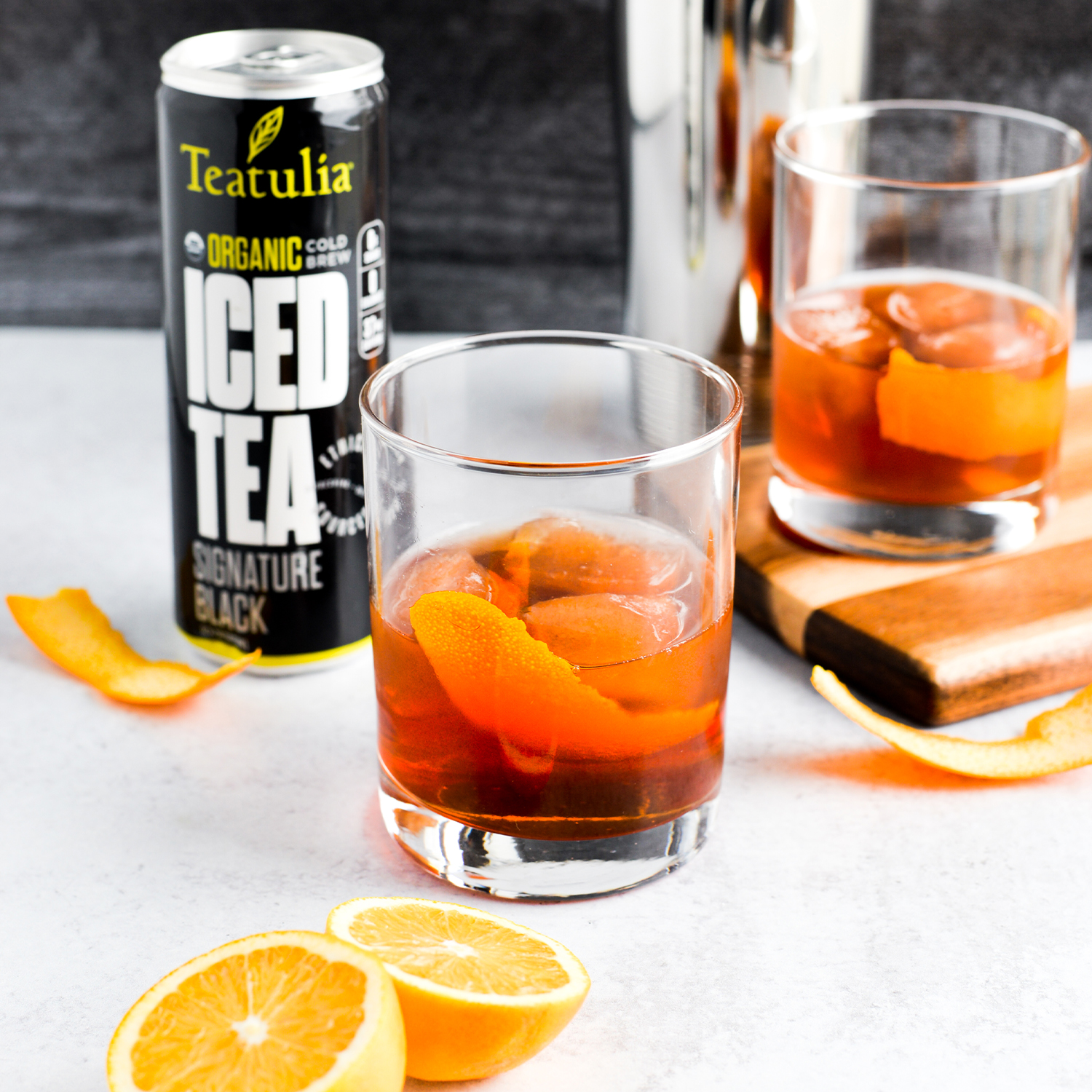 Peel 2 inches of orange rind with a vegetable peeler add to glass. Add tea Iced Cubes. Pour bourbon mix over ice. Swirl and enjoy.